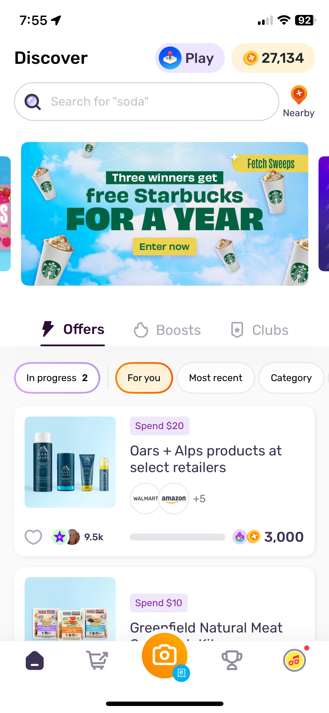 Fetch라는 앱은 사용자가 구매한 물건의 영수증을 사진으로 찍어 올리면 포인트를 주는 앱이에요. 한 장의 영수증에 25포인트를 주는데, 앱의 메인 화면에 뜨는 이벤트 중인 물건들을 구매하게 되면 그 이벤트에 맞는 추가 포인트를 더 받을 수 있습니다. 그렇게 모은 포인트로 각종 브랜드의 e-gift 카드를 받을 수 있어요.