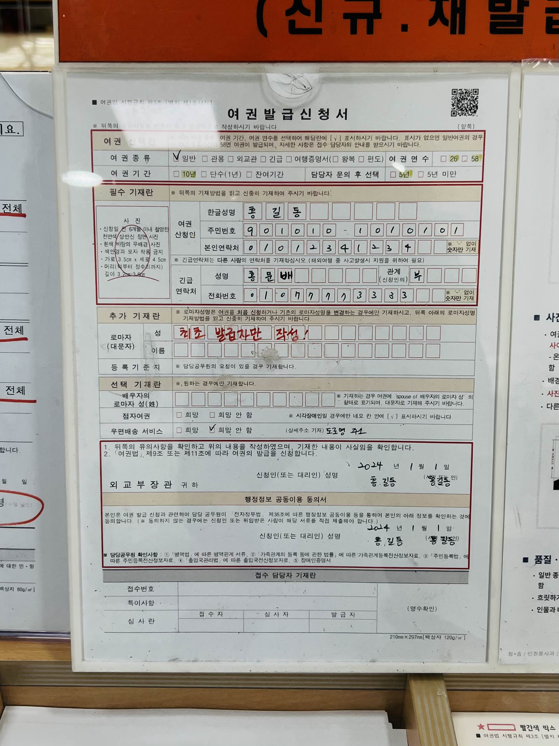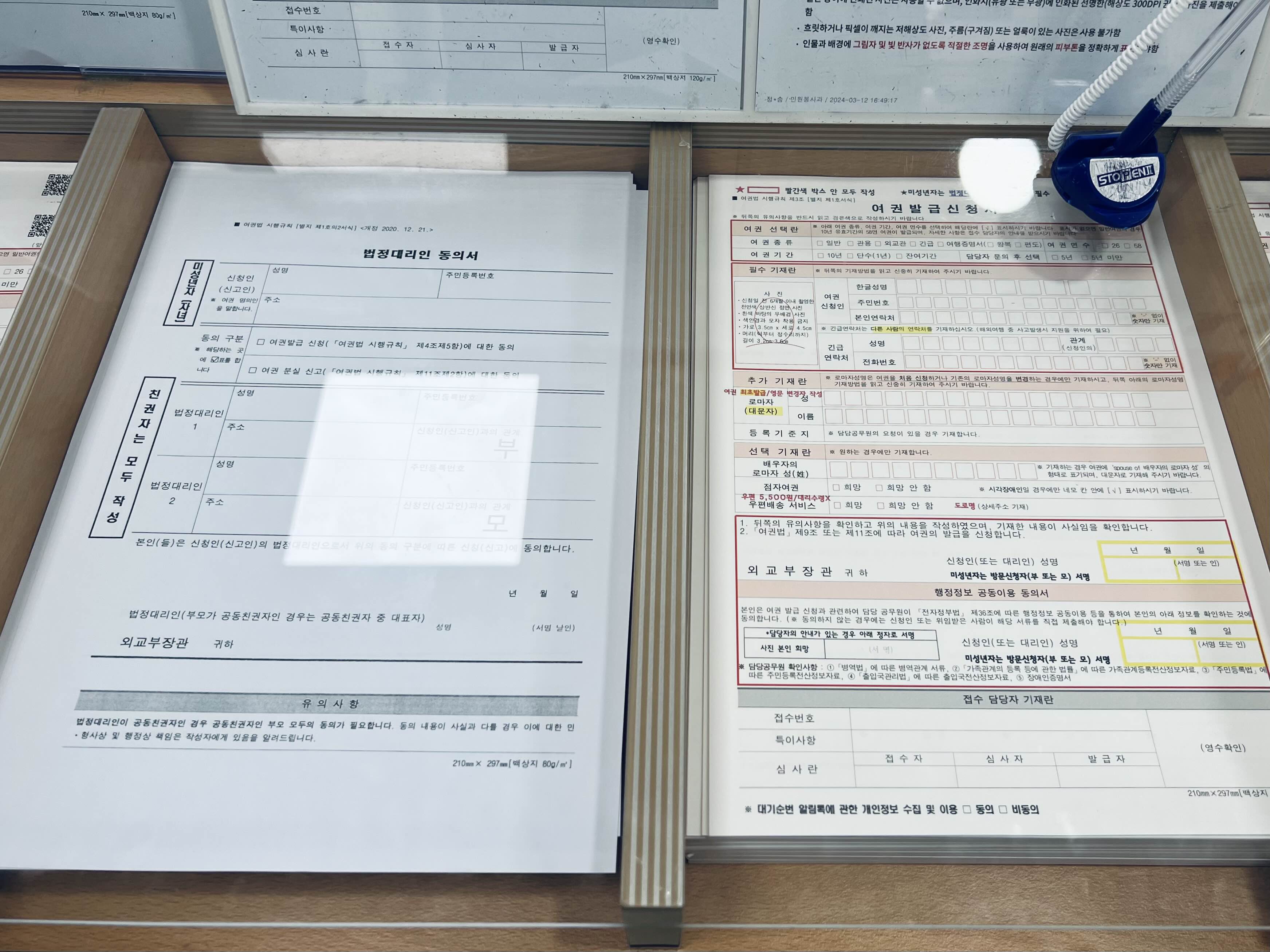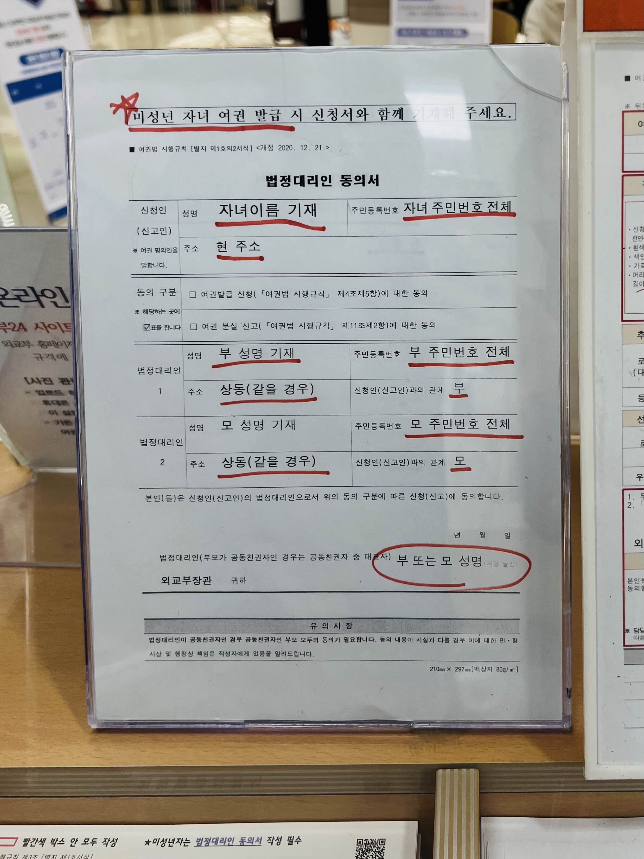 여권 갱신이나 신청시 작성해야 하는 서류는 구청에 구비되어 있어서 저는 방문해서 직접 작성을 했습니다. 미성년자 자녀의 경우에는 법정대리인 동의서도 함께 작성해야 하는데 작성방법 예시 또한 구비되어 있어서 그걸 보고 작성했어요. 그렇기에 작성방법에는 크게 어려움이 없었습니다. 다만 법정대리인의 신분증이 있어야 하니 꼭 지참하시기 바라요!